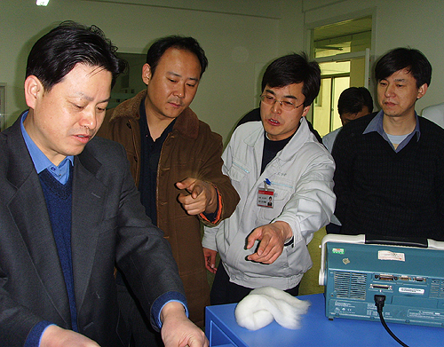 中國纖維檢驗局總工程師徐水波、棉花質(zhì)量監(jiān)督處副處長于小新、熊宗偉、儀器計量科主任張保國及陜西省纖維檢驗局局長仲學(xué)憲一行5人在公司總經(jīng)理薛冬泉的陪同下參觀了產(chǎn)品陳列室和生產(chǎn)線,了解了公司發(fā)展和產(chǎn)品研發(fā)生產(chǎn)情況,特別是對我公司棉纖維檢測儀器的研制情況進行了詳細(xì)了解,與工程技術(shù)人員就產(chǎn)品研發(fā)進行了座談,對我公司棉纖維檢測儀器的研發(fā)進行了技術(shù)指導(dǎo)。希望長嶺紡電按照國家棉花質(zhì)量檢驗體制改革的要求,繼續(xù)加快產(chǎn)品研發(fā)進度,盡快推出適應(yīng)國際標(biāo)準(zhǔn)、滿足市場需求的棉纖維檢測儀器,為推進我國棉花質(zhì)量檢驗體制改革發(fā)揮積極作用。