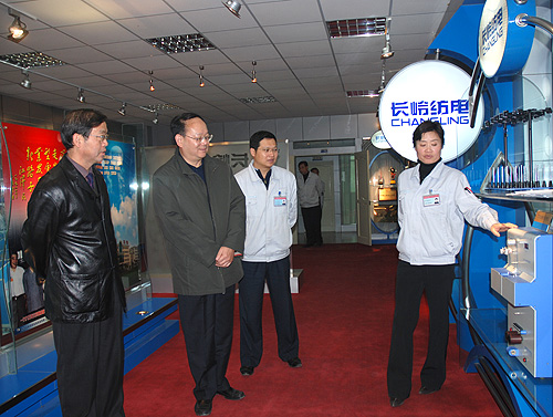 中國紡織工業(yè)協(xié)會副會長高勇首先參觀了高新開發(fā)區(qū)長嶺紡電工業(yè)園工地現(xiàn)場。隨后,高會長一行蒞臨紡電公司本部,參觀了產(chǎn)品陳列室、紡電紡研所實驗室和制造部生產(chǎn)現(xiàn)場。在聽取了公司董事長李強(qiáng)、總經(jīng)理薛冬泉關(guān)于企業(yè)發(fā)展和公司新產(chǎn)品研發(fā)方面的工作匯報后。高會長對長嶺紡電多年來不斷堅持自主創(chuàng)新,引領(lǐng)國內(nèi)行業(yè)發(fā)展,為中國紡織行業(yè)技術(shù)升級做出的貢獻(xiàn)給予高度評價。他詳細(xì)詢問、了解了公司噴氣織機(jī)電控箱項目的進(jìn)展情況,并介紹了歐洲和日本在噴氣織機(jī)方面的最新技術(shù)和發(fā)展趨勢。