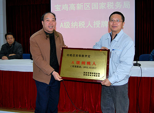 日前,寶雞高新區(qū)國(guó)稅局副局長(zhǎng)趙文君,監(jiān)察室主任馮超英一行代表陜西省地方稅務(wù)局、陜西省國(guó)家稅務(wù)局為為我公司現(xiàn)場(chǎng)頒發(fā)陜西省誠(chéng)信納稅A級(jí)榮譽(yù)牌,這是我公司第二次獲此殊榮。